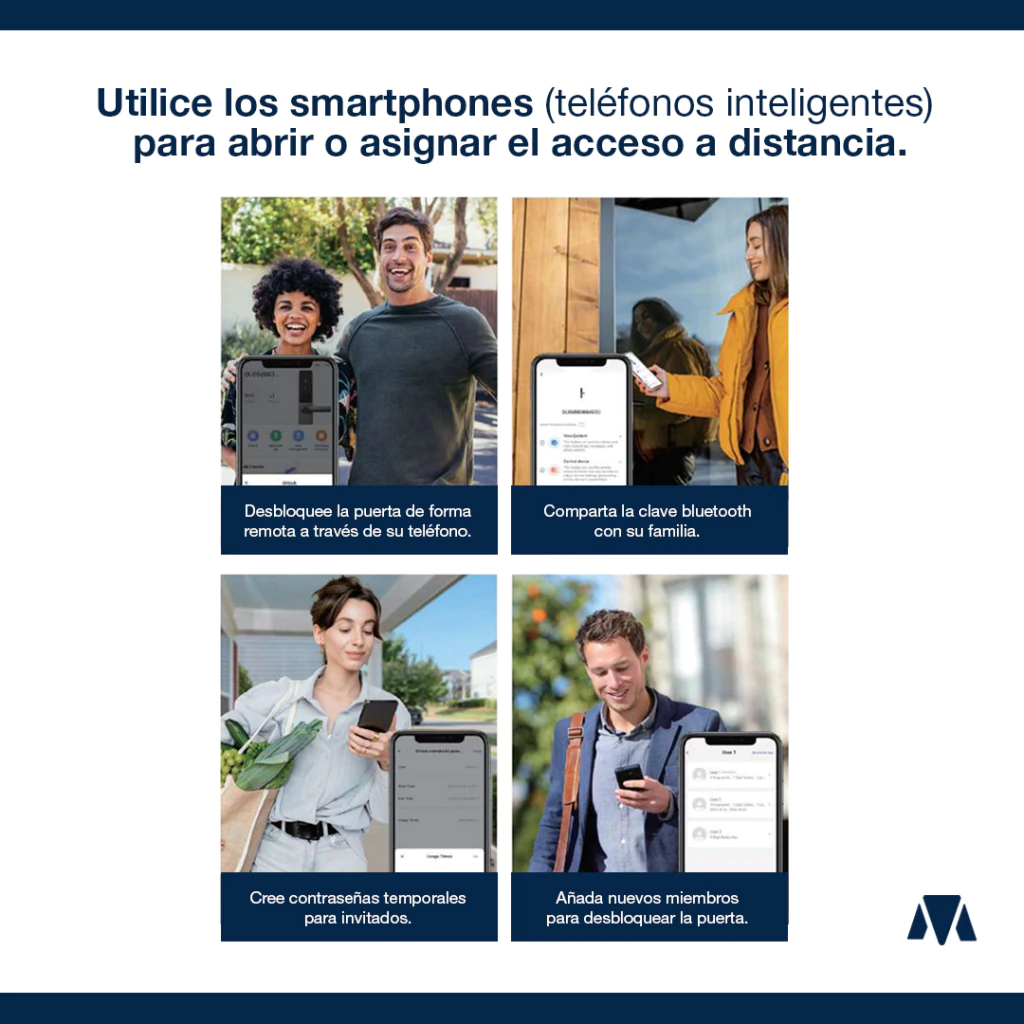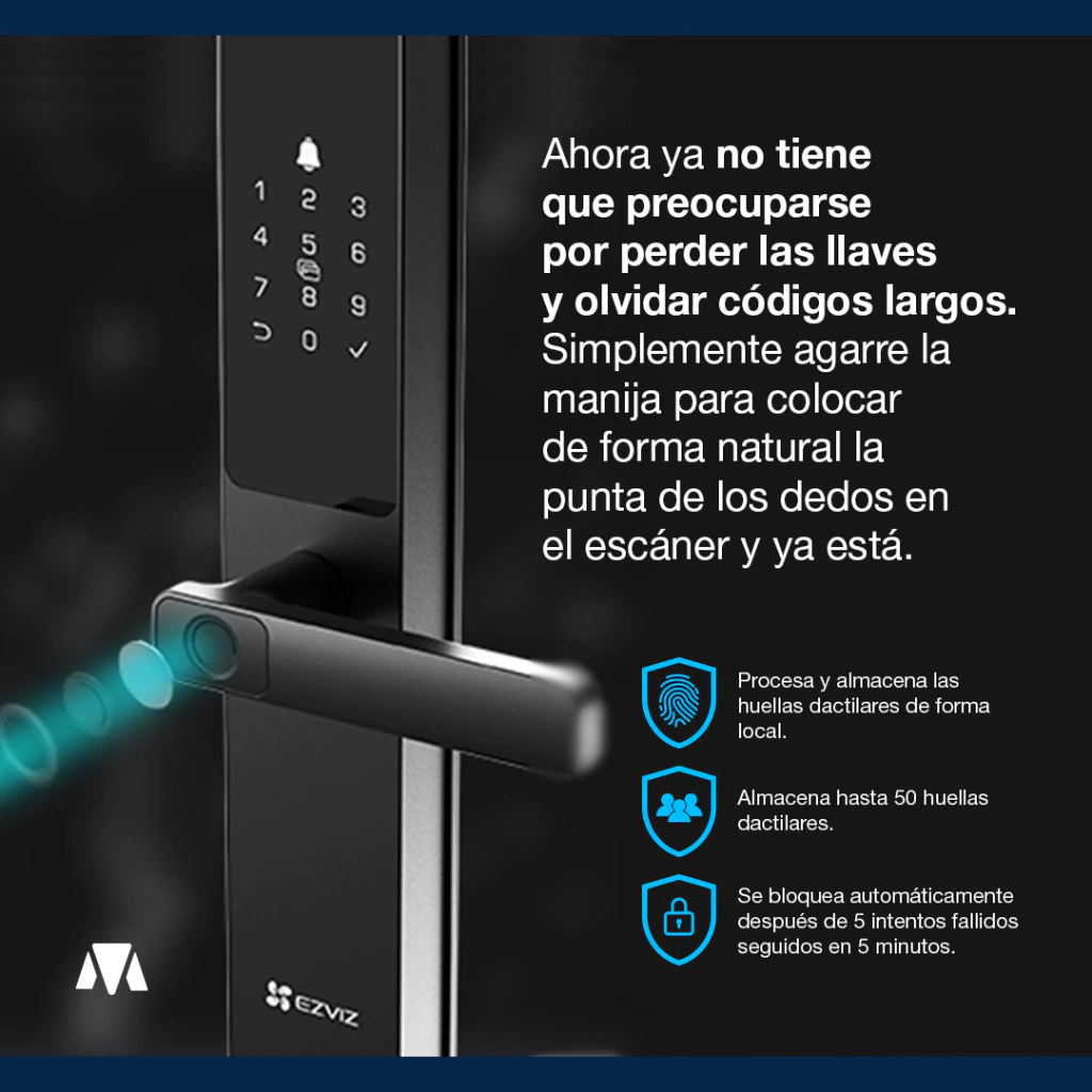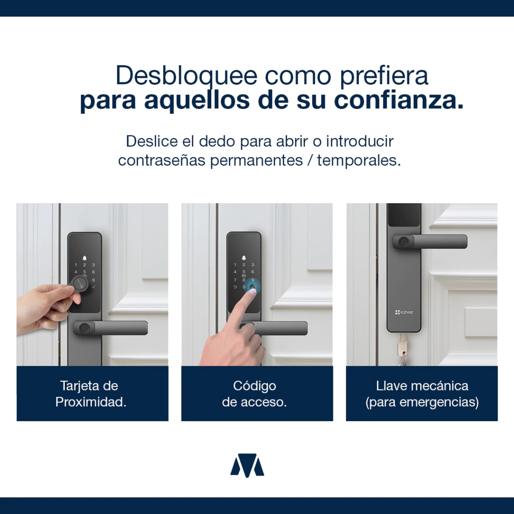 • Múltiples Métodos de Desbloqueo: (Huella dactilar, código de acceso, tarjeta de proximidad, llave mecánica, llave bluetooth a través de la aplicación EZVIZ, códigos temporales, desbloqueo remoto)